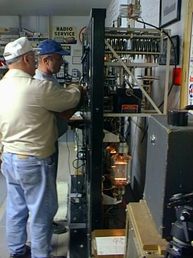 Transmitter: Comprising most of the three six-foot relay racks, this 1KW transmitter uses push-pull 204A finals and a pair of 851's in the modulator. You can see the glow of the 851 modulator tubes in the right-side picture. The transmitter was restored by Bob W2ZM.