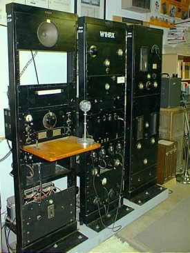Transmitter: Comprising most of the three six-foot relay racks, this 1KW transmitter uses push-pull 204A finals and a pair of 851's in the modulator. You can see the glow of the 851 modulator tubes in the right-side picture. The transmitter was restored by Bob W2ZM.