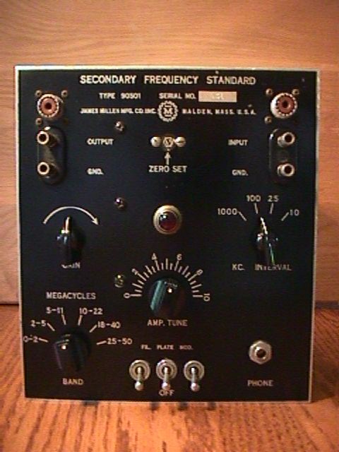 The Millen frequency standard probably didn't see much use in the ham shack as it did it the laboratory environment. It has an adjustable RF output in intervals of 10, 25, 100 and 1000 Kcs with useful signal strength to 50 Mcs. It also incorporates an internal 800 cycle audio generator/modulator and a detector with phone jack. The unit runs from a very stable helium filled 1000 Kcs vacuum quartz oscillator and uses synchronized multivibrator oscillators to create the 10, 25 and 100 Kcs markers.