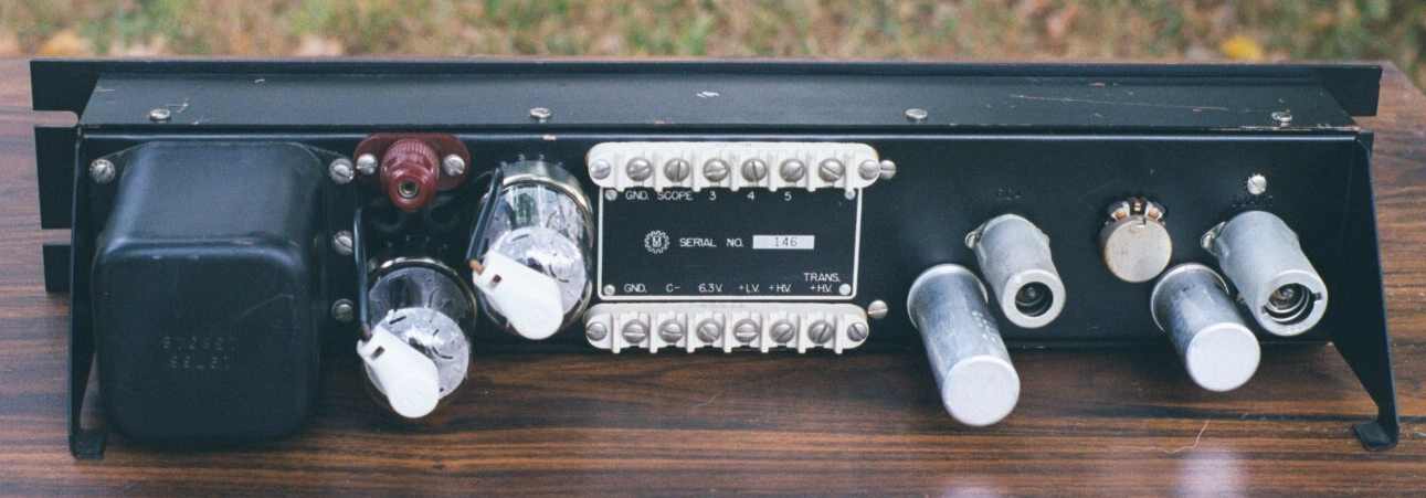 stages consist of the 6C4 and 12AX7 vacuum tubes. The 90831 is a rather rare item in the Millen arsonal. However, it has been found in several variations as shown in the pictures above. The variation three pictures are those of a later model which belongs to Tom Smith N5AMA. The variation two picture is a early model belonging to Gary Carter WA4IAM. Notice that the early version uses a meter layout like that in the 90801 transmitter pictured elsewhere on this website. The later version uses a standard type meter with its own external case bezel. You can tell that both are original by the difference in labeling Millen used. Gary's early model does use 6146 modulators however. We thought we had all the answers and then variation one was discovered at the AWA flea market during the 2001 conference. At first it was thought to be a very early prototype or production run. However, it was later discovered in the 1959-1960 Millen catalog. Thus, the large front panel version, 5.25" vs 3.5" used in variation one and two, appeared to be the last of the 90831 modulators or at least a later variation made for a special reason. You can see from the rear view that it is socketed for the same 6146 tubes. From catalog pictures of the rear chassis it originally contained a much larger cylinder shaped modulation transformer and had a battery mounting bracket on the side of the transformer to house a 45 VDC dry cell for modulator tube biasing. Both these items were missing on the fleamarket find! But wait! An interesting twist occurs when you look closely at the picture of the modulator in the 59-60 catalog. You see that it has the 807 modulator tubes, but the associated text indicates that 6146's are used. My guess is that variation one is indeed a first run model of the 90831 modulator since it is the only one that I've ever seen 807 modulators tubes in, albeit just a picture. My quess is that by 1959 they were not selling many of these modulators anymore and whomever pulled the picture to include in the catalog grabbed an old version of the unit. Another hint that it is an early series modulator is that neither the catalog pictured unit or this one seen at the flea market have serial number ID plates. So which was really first? The basic design is from the later 40's using 807's, and the Millen schematic for the 6146 version is dated the end of 1953. The 3.5" panel 90801 transmitter with the variation two look was produced starting mid-year 1953. Anyone with additional information on the variations please share with us what you know. |