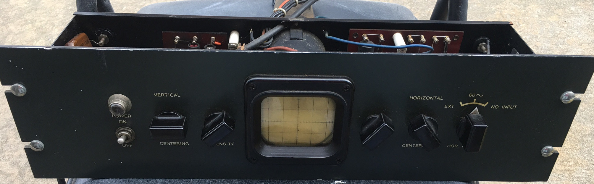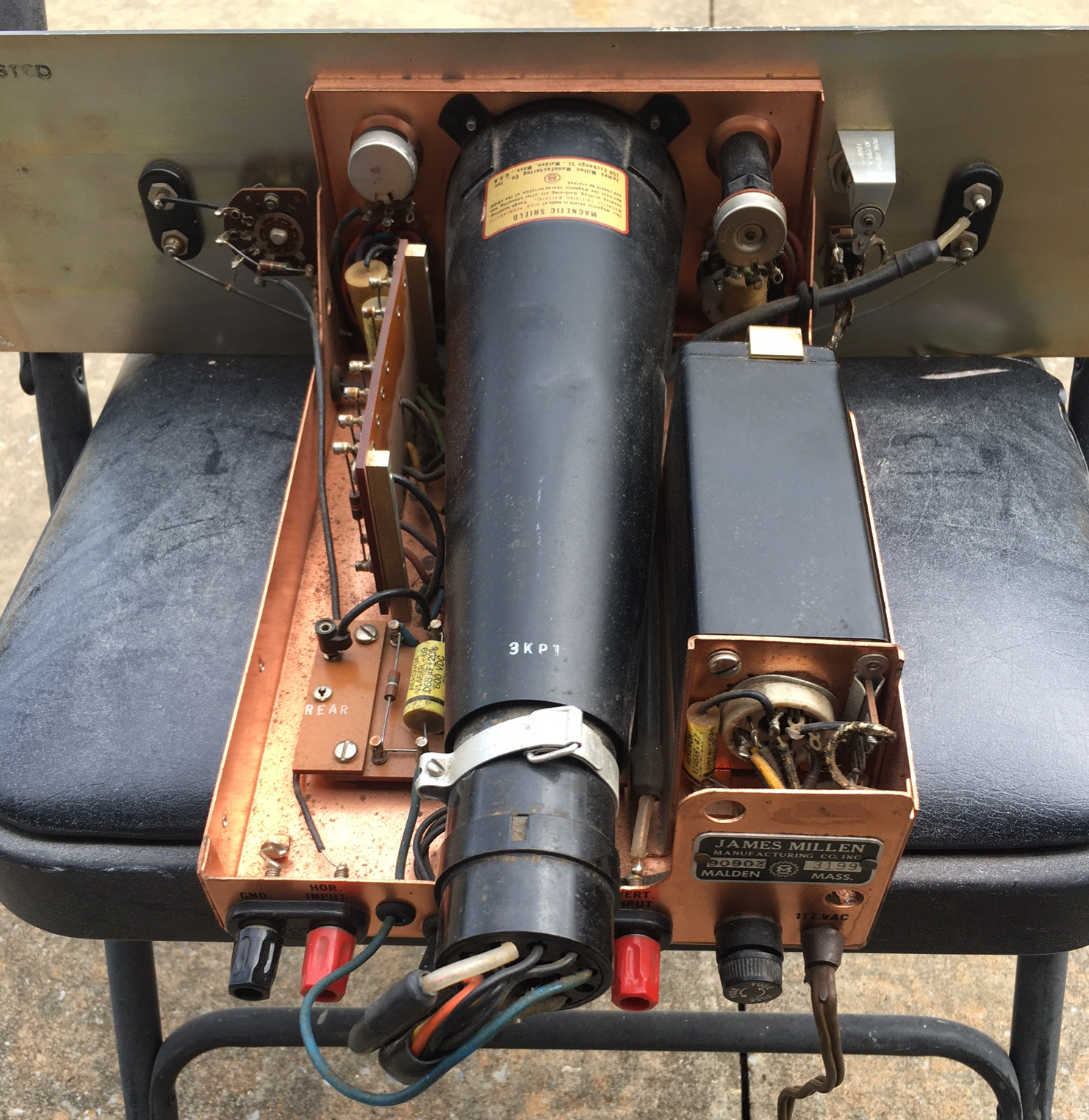 This variant is very similar to the original advertised 90903.  The front panel controls are all in the same location and the electronics is similar too.  They did remove the front panel horizontal and vertical binding posts, but the rear terminals are in place like the original 90903.  My guess is this at one point had the cover over the protruding CRT as that is held on by only two nuts that are to the right and left of the CRT neck (see original 90903 pictures).  The actual chassis is a flat black painted brass exactly as expected.