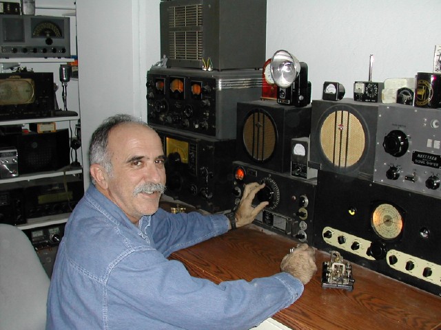To the left of the HRO is a National RAO-7 and on top of that receiver is a Hallicrafters SX-28. The other radios are a 1936 RCA ACR-175 and a Meissner Signal Drifter (Shifter) which was what Dave was transmitting on during SKN. He has several 1930's RCA receivers also. They are neat radios and not seen often.  Behind him you can see a couple of Howard's, an RME84 and a Swan 500CX.